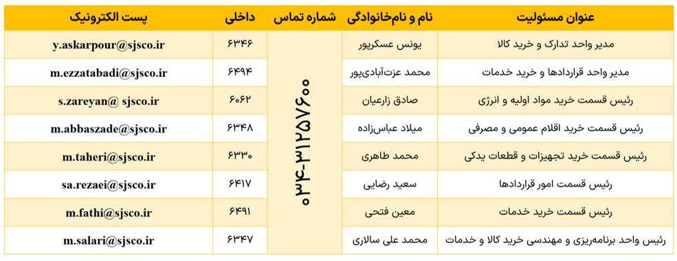 در راستای تسهیل ارتباطات و پاسخگویی مؤثر به تأمینکنندگان و پیمانکاران محترم، اطلاعات تماس مدیران، رؤسا و کارشناسان واحد خرید و تأمین در جدول زیر ارائه شده است.