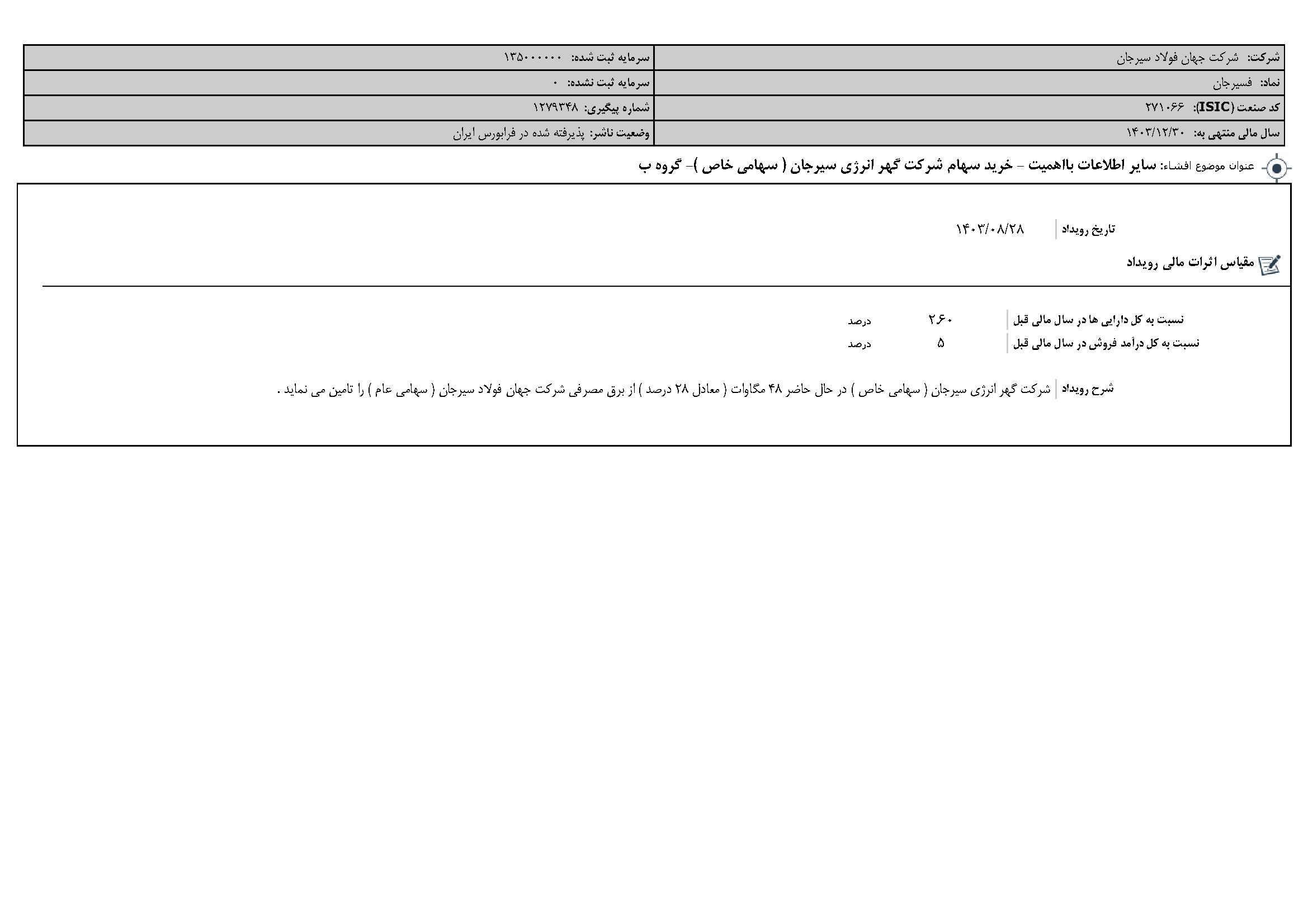 افشای اطلاعات بااهمیت - (سایر اطلاعات بااهمیت - خرید سهام شرکت گهر انرژی سیرجان ( سهامی خاص )- گروه ب) منتهی به سال مالی ۱۴۰۳/۱۲/۳۰
