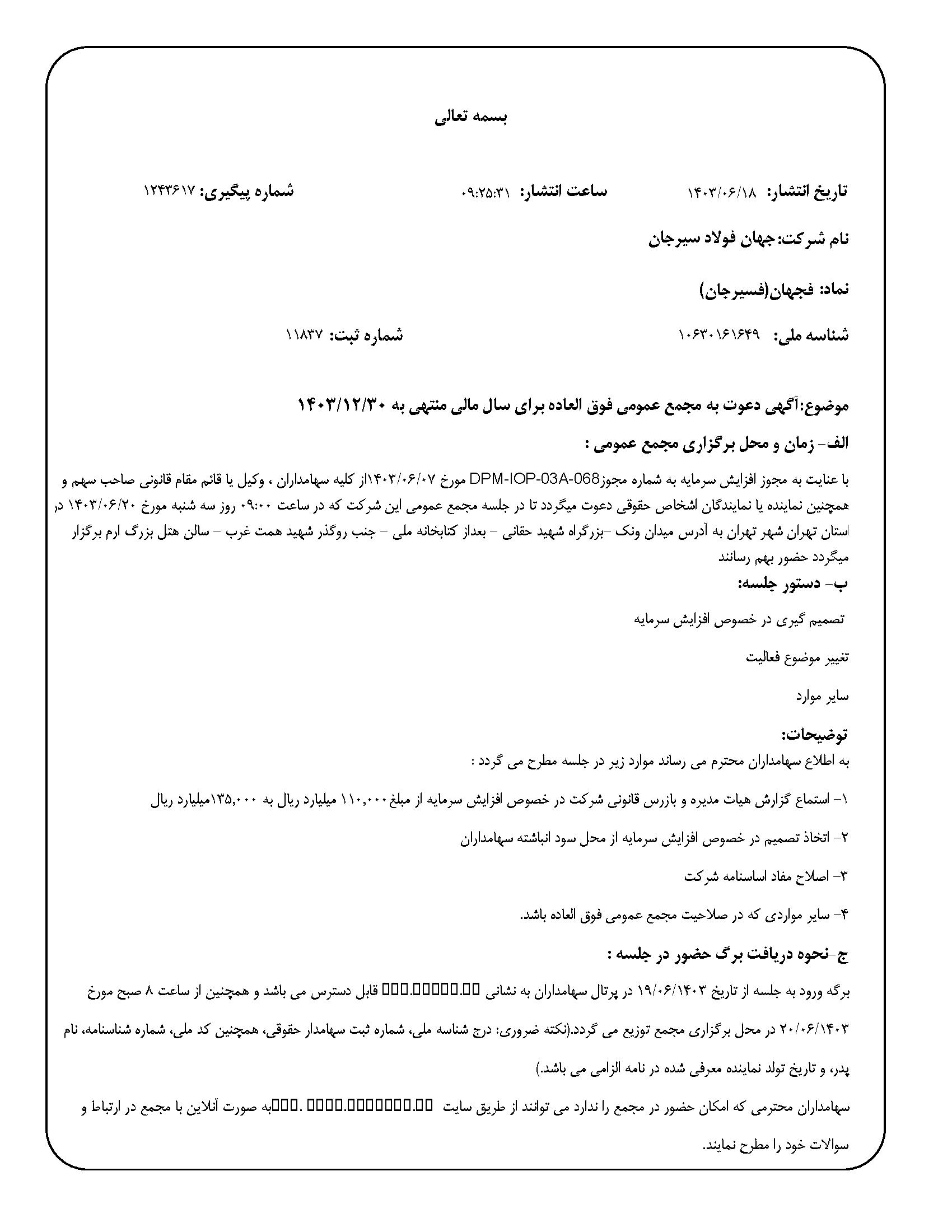 شرکت جهان فولاد سیرجان (سهامی عام) - آگهی دعوت به مجمع عمومی فوق العاده دوره ۱۲ ماهه منتهی به ۱۴۰۳/۱۲/۳۰ (اصلاحیه)