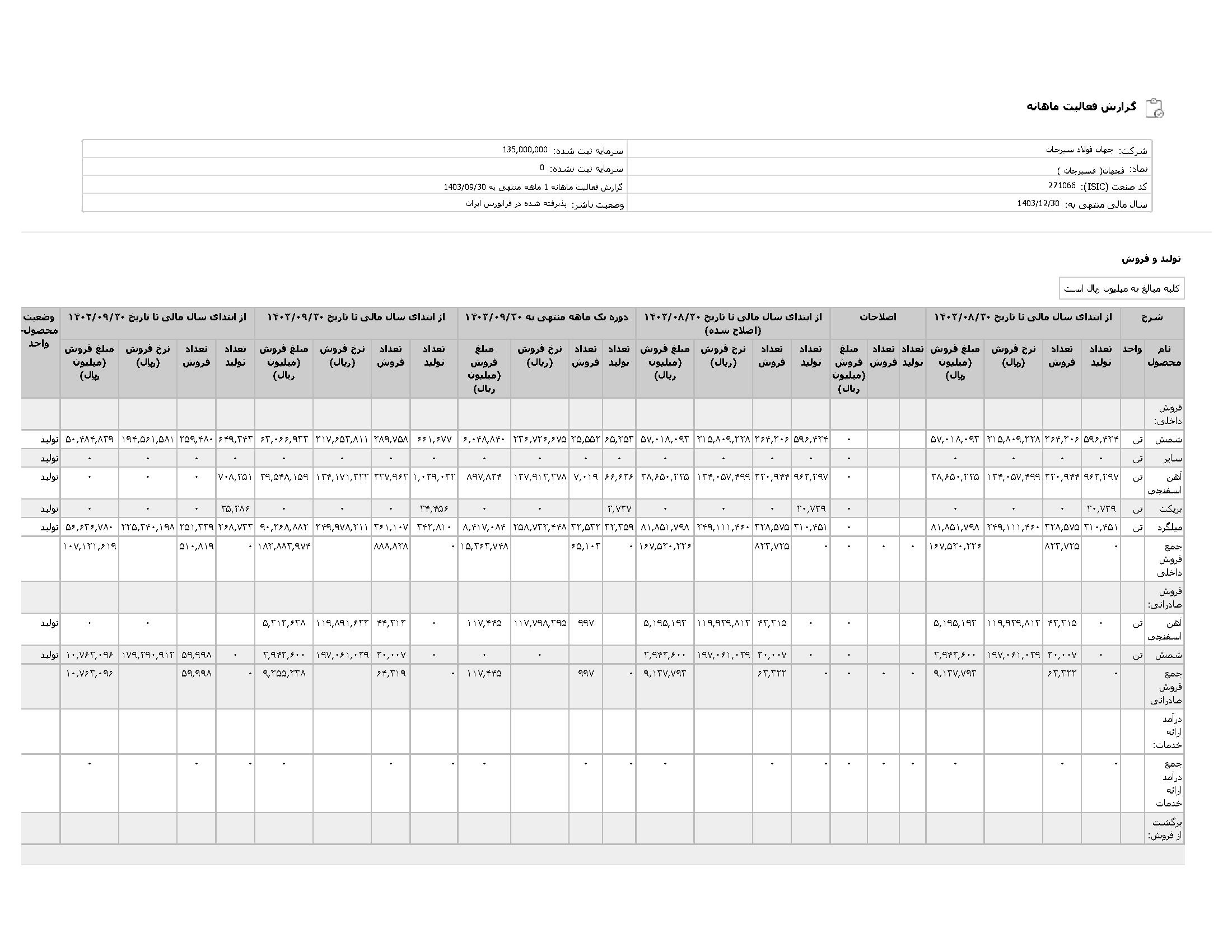 شرکت جهان فولاد سیرجان (سهامی عام) - گزارش فعالیت ماهانه دوره ۱ ماهه منتهی به ۱۴۰۳/۰۹/۳۰ / تاریخ انتشار 1403/10/05