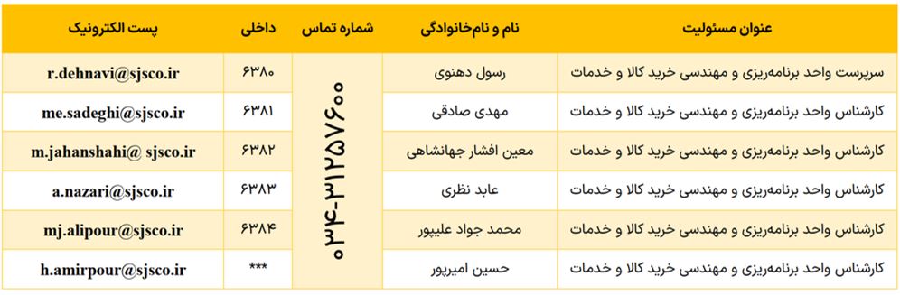 در راستای تسهیل ارتباطات و پاسخگویی مؤثر به تأمینکنندگان و پیمانکاران محترم، اطلاعات تماس مدیران، رؤسا و کارشناسان واحد خرید و تأمین در جدول زیر ارائه شده است.