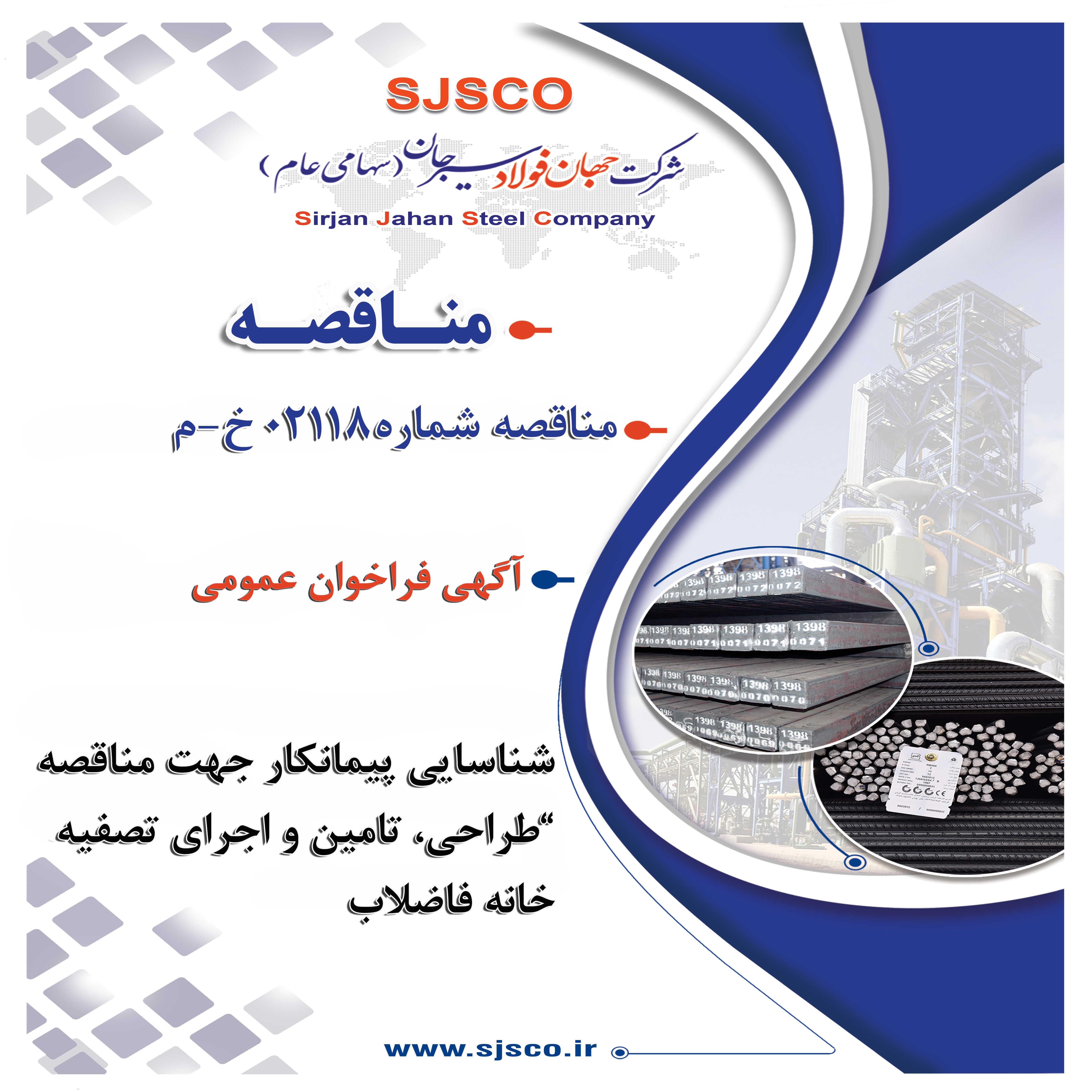 " آگهی مناقصه عمومی " طراحی، تأمين و ساخت سوله Workshop واحد گازهای صنعتی شركت جهان فولاد سيرجان بصورت EPC" " مناقصه شماره 02114-خ-م"
