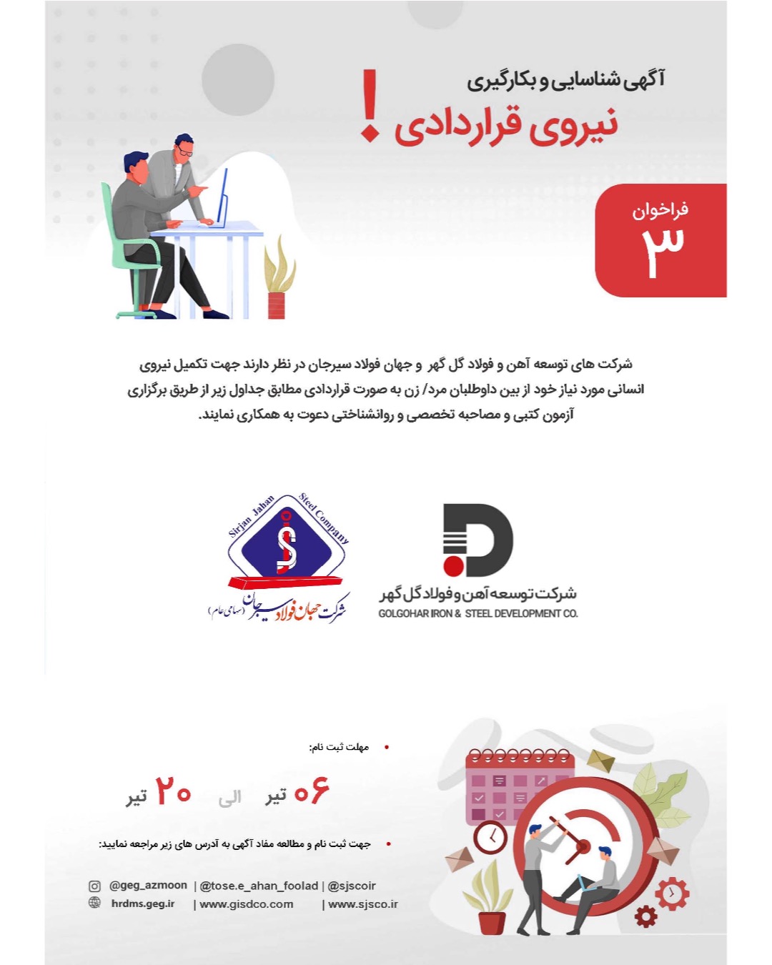 شرکت های جهان فولاد و توسعه آهن و فولاد گل گهر در نظر دارند جهت تکمیل نیروی انسانی مورد نیاز خود از بین داوطلبان مرد/زن به صورت قراردادی مطابق جداو...