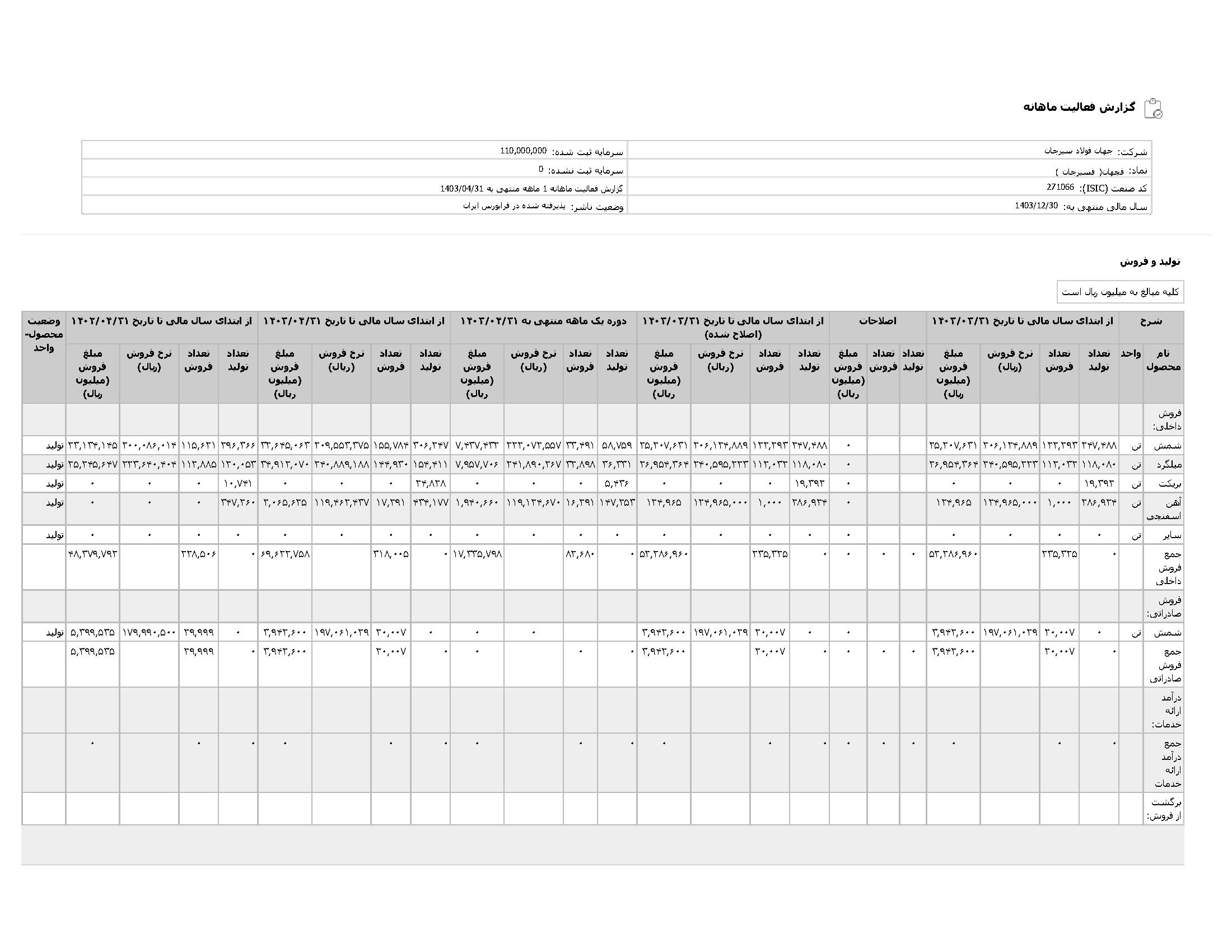 شرکت جهان فولاد سیرجان (سهامی عام) - گزارش فعالیت ماهانه ۱۴۰۳/۰۵/۰۶