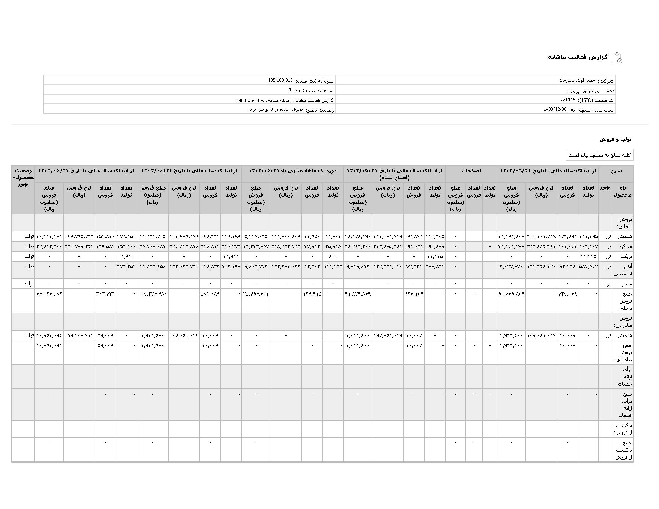 شرکت جهان فولاد سیرجان (سهامی عام) - گزارش فعالیت ماهانه دوره ۱ ماهه منتهی به ۱۴۰۳/۰۶/۳۱ / تاریخ انتشار ۱۴۰۳/۰۷/۰۷