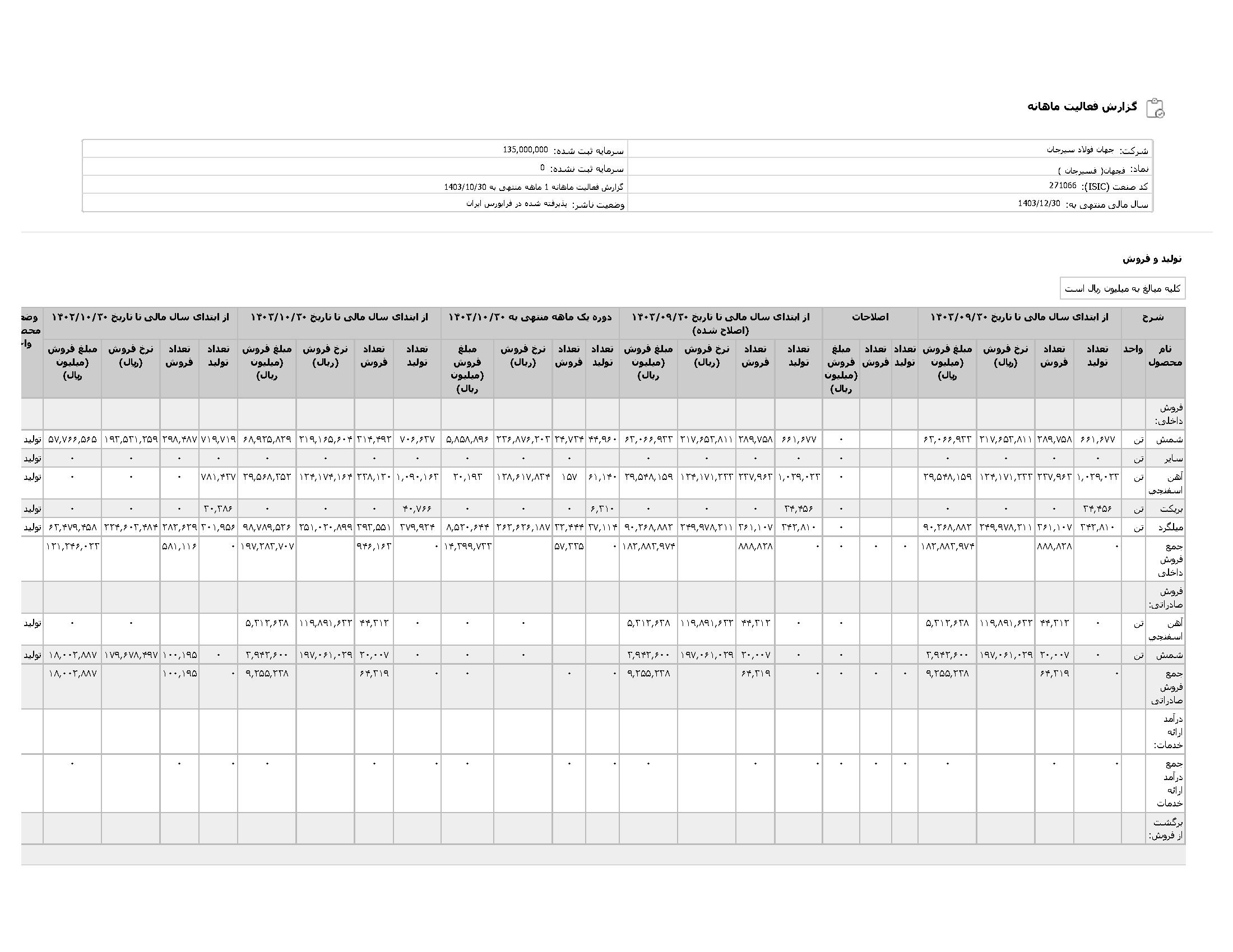 شرکت جهان فولاد سیرجان (سهامی عام) - گزارش فعالیت ماهانه دوره ۱ ماهه منتهی به ۱۴۰۳/۱۰/۳۰ / تاریخ انتشار 1403/11/06