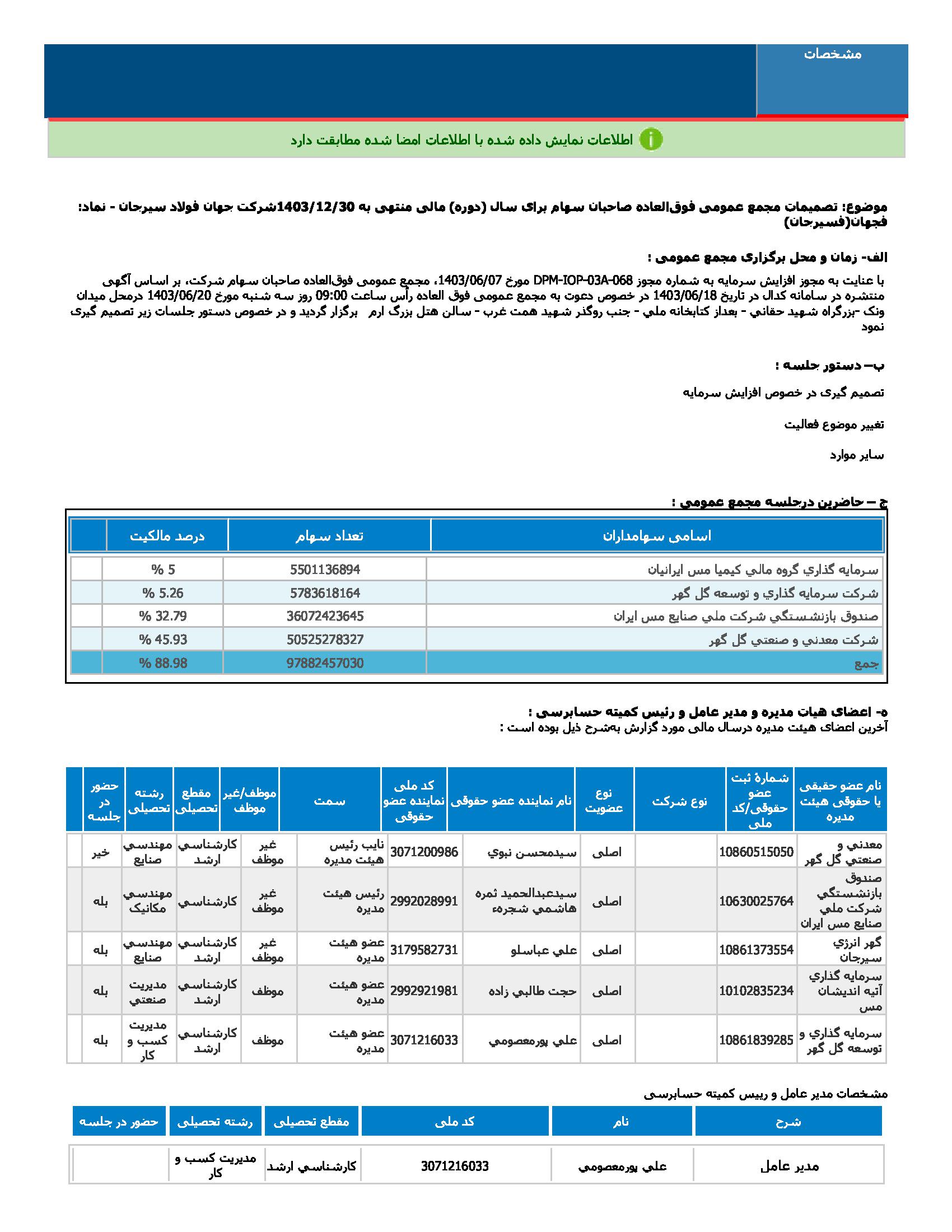 شرکت جهان فولاد سیرجان (سهامی عام) - تصمیمات مجمع عمومی فوق العاده دوره ۱۲ ماهه منتهی به ۱۴۰۳/۱۲/۳۰، تاریخ انتشار۱۴۰۳/۰۶/۲۰